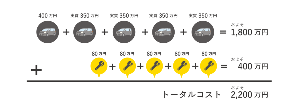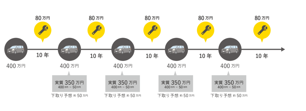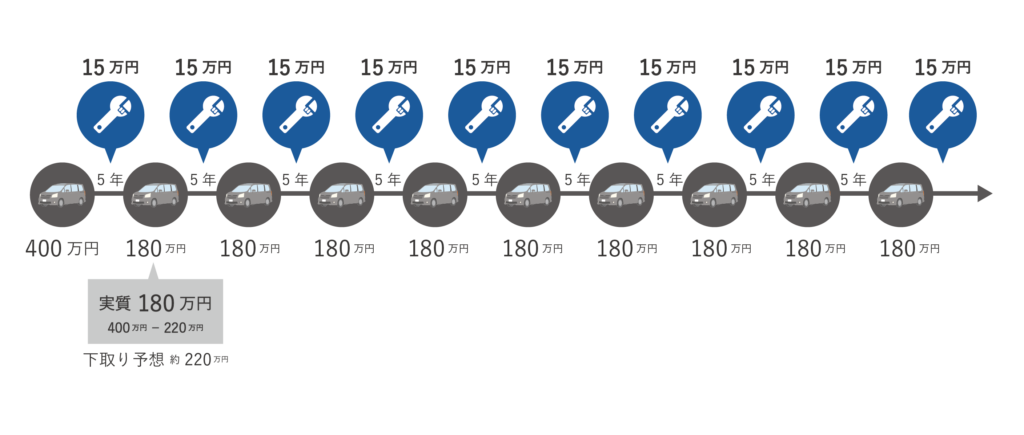 仮に生涯で、車に乗る期間が50年だったとしたら、その間に車を5年サイクルで乗り換えたとすると…